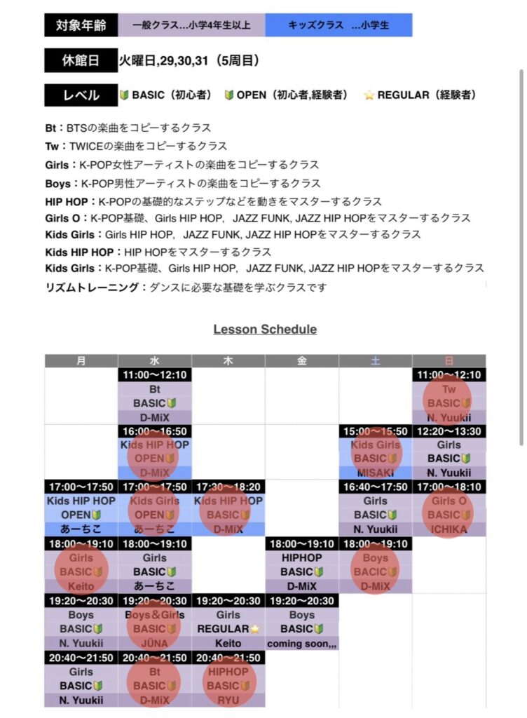 下の赤丸🔴がついているクラスが発表会に参加します。